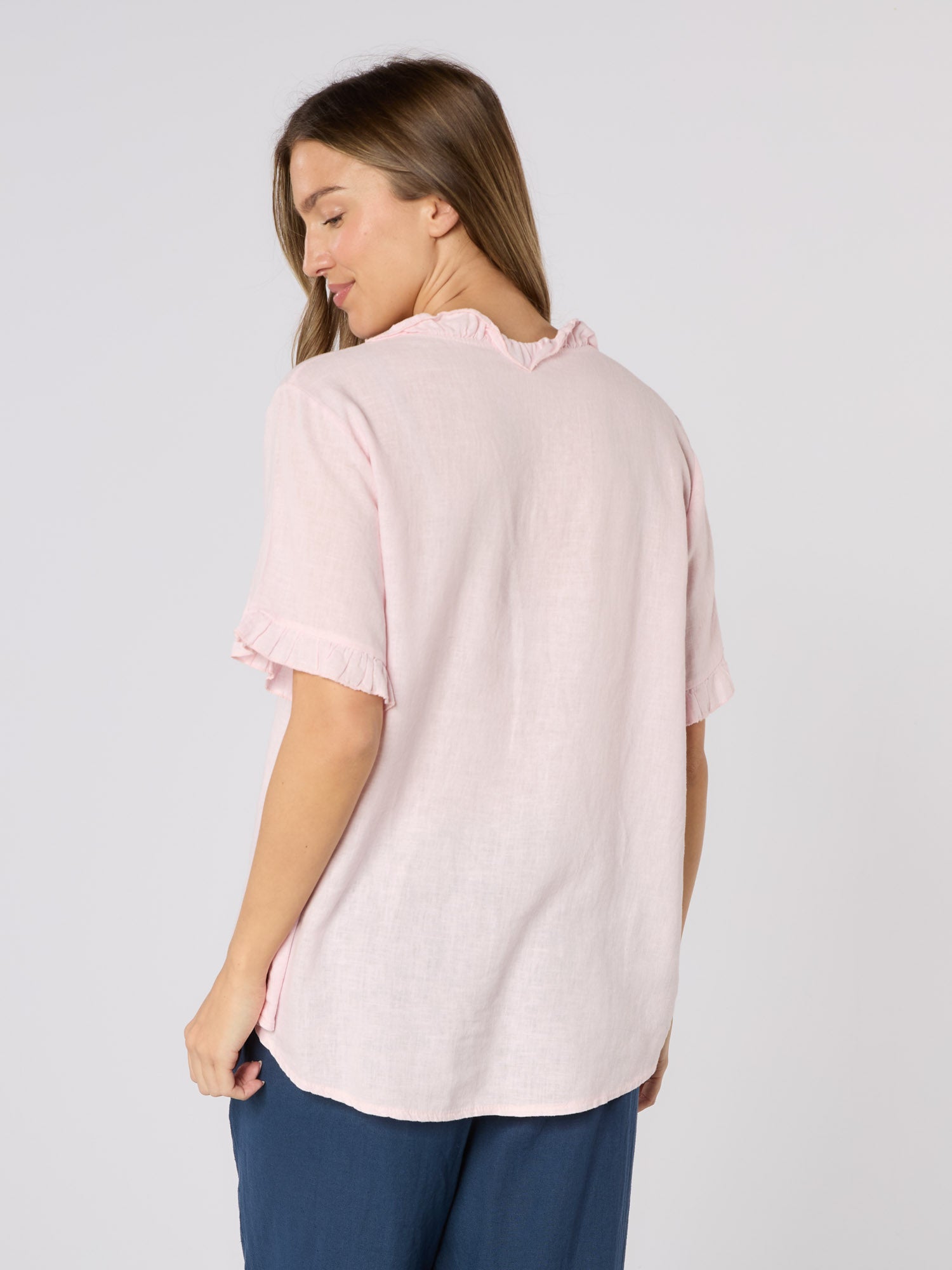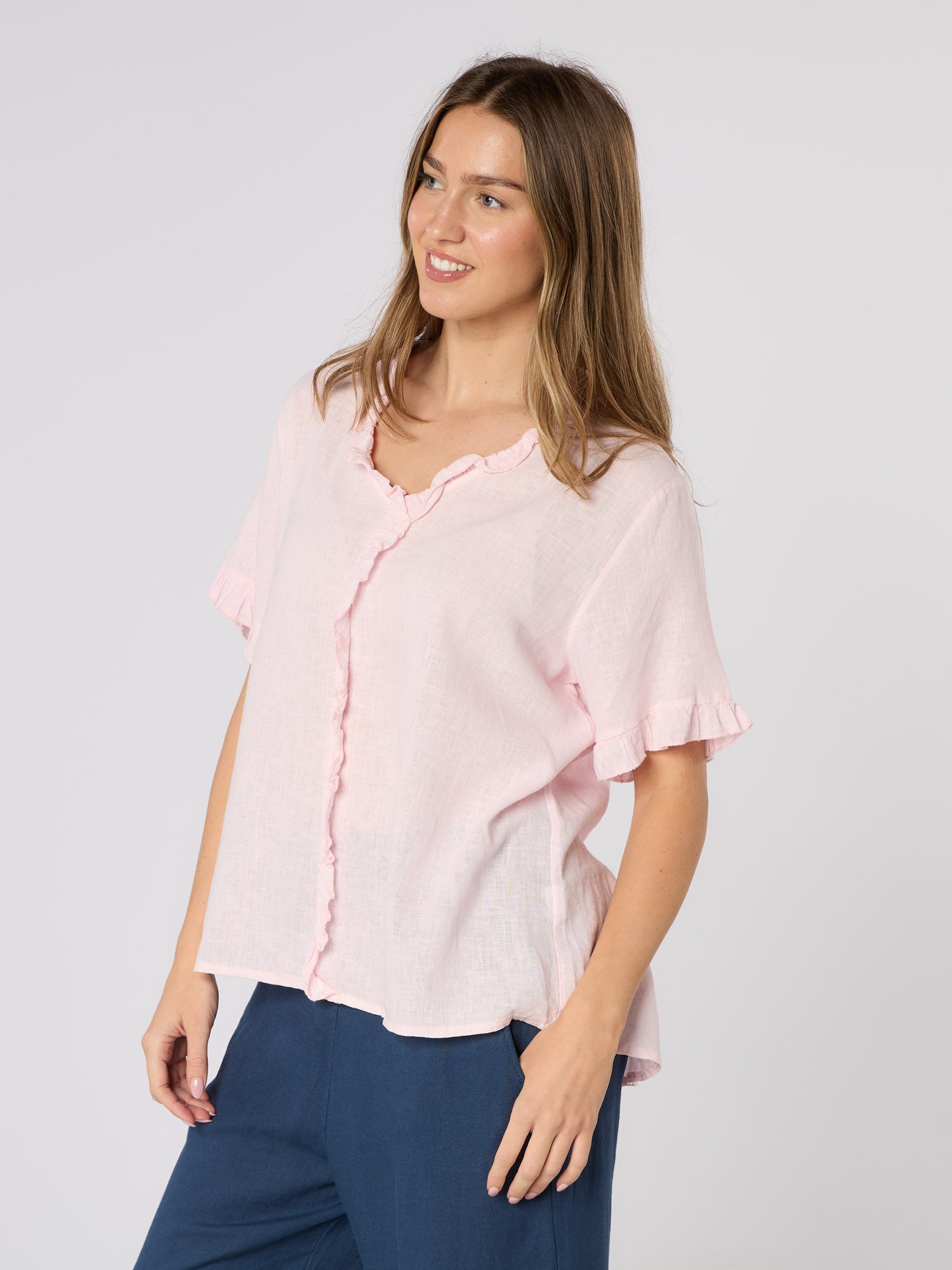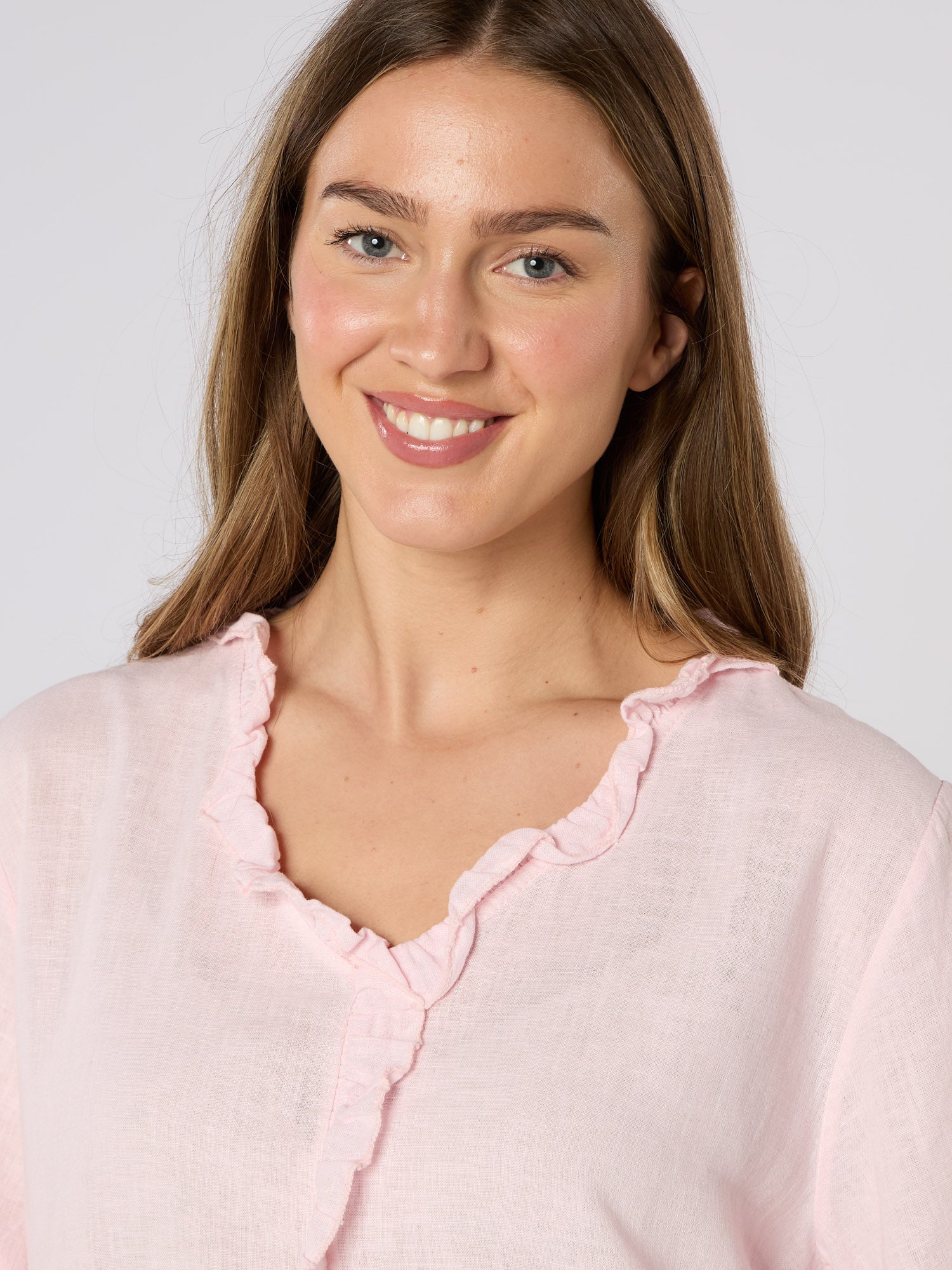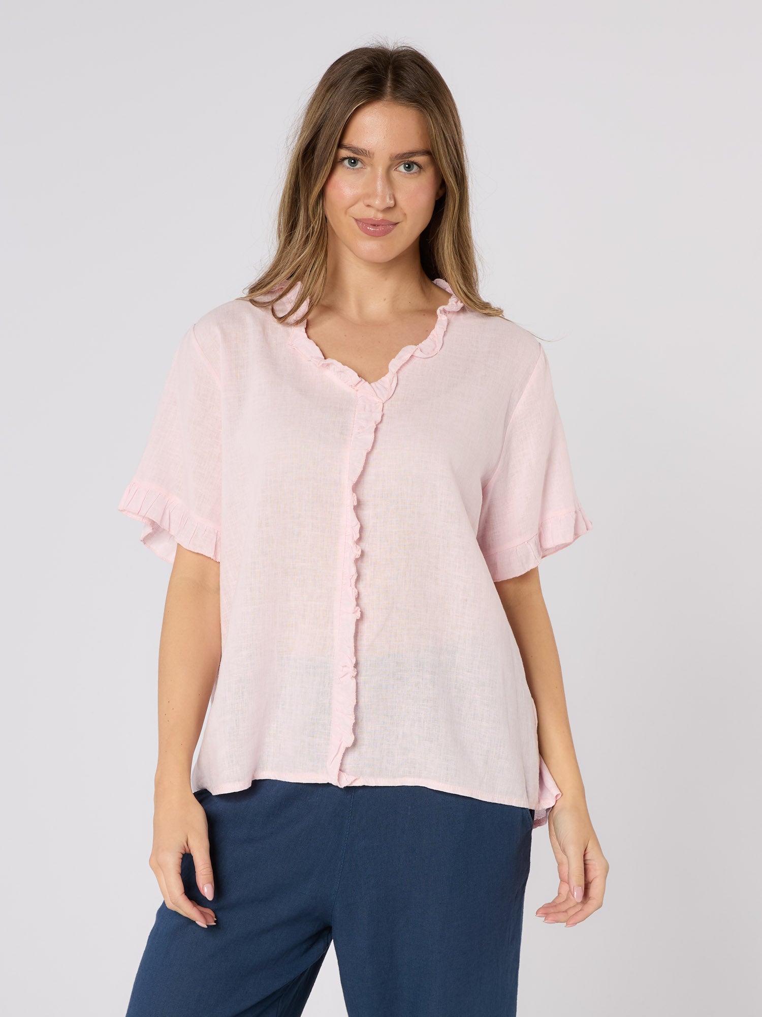 The Renazzo Short Sleeved Linen Top is a stylish addition to any wardrobe. With a flattering frill detail at the neck, front and sleeve.